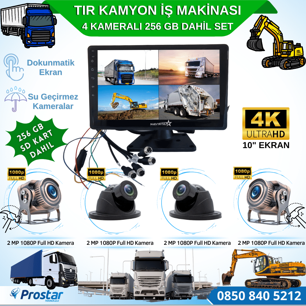 256 Gb Dahil 4 Kameralı 10 Inç Dokunmatik Ekranlı Tır Kamyon Tak Kullan Kamera Seti