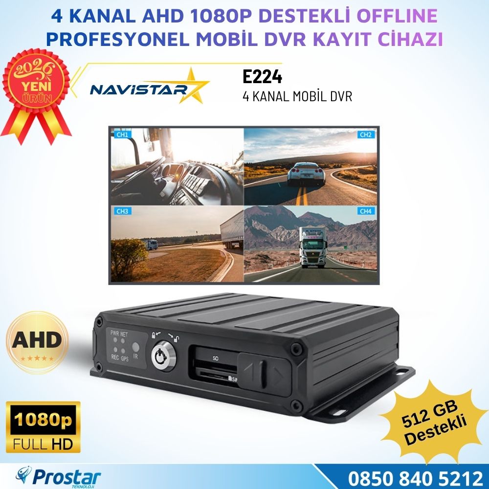 Navistar E224, ticari filolar, kamyonlar, otobüsler ve özel araçlar için geliştirilmiş 4 kanallı profesyonel mobil DVR (Mobil Dijital Video Kaydedici) cihazıdır. 2026 model yeni nesil tasarımıyla piyasaya sunulan E224; yüksek çözünürlüklü kayıt kapasitesi, akıllı depolama yönetimi ve araç güvenliğini artıran gelişmiş özellikleriyle öne çıkmaktadır.